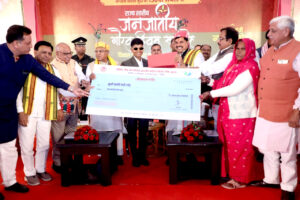 राज्यपाल श्री मंगुभाई पटेल और मुख्यमंत्री डॉ. मोहन यादव ने जबलपुर में राष्ट्रीय जनजातीय गौरव दिवस पर आयोजित समारोह विश्व विजेता महिला क्रिकेट टीम की सदस्य क्रांति गौड़ को एक करोड रुपए की प्रोत्साहन राशि का चेक भेंट किया