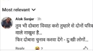 पूर्व सांसद आलोक संजर के रॉबर्ट वाड्रा की पोस्ट पर कमेंट के वाद। विवाद खड़ा हो गया है उन्होंने सोशल मीडिया कमेंट में कहा की तुम भी दोबारा विवाह करो, दोनों परिवार वाले नाखुश हैं। फिर दोबारा चुनाव करवा देंगे-दुखी लोगों..
