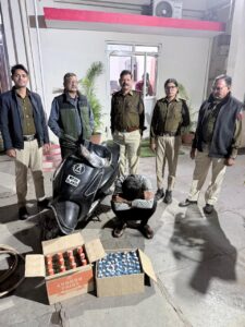 कलेक्टर श्री शिवम वर्मा के आदेश पर आबकारी टीम के द्वारा शहरी क्षेत्र में विभिन्न स्थानों पर अवैध मदिरा के विरुद्ध प्रभावी कार्यवाही की गई। आज की कार्यवाही में शंका के आधार पर एक दोपहिया वाहन को रोककर उसके आगे के स्पेस में रखे दो पेटियों को खोलकर उसकी तलाशी लेने पर उसमें एक पेटी में 50 पाव देशी मदिरा प्लेन व दूसरी पेटी में 12 बोतल लण्डन प्राईड विदेशी मदिरा पायी गई। अवैध रूप से परिवहन कर ले जाई जा रही मदिरा जप्त कर आरोपी विपुल पिता श्री रामलाल तिवारी निवासी- मच्छी बाजार, इंदौर को रंगे हाथ गिरफ्तार किया गया। आरोपी के विरुद्ध आबकारी अधिनियम 1915 की धारा 34 (1) क के तहत प्रकरण पंजीबद्ध कर विवेचना में लिया गया है। जब्त मदिरा और वाहन की कीमत 76910 रुपए आंकी गई है।