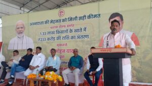 जल संसाधन मंत्री श्री तुलसीराम सिलावट ने कहा कि किसान हमारा अन्नदाता है, जो भर गर्मी, बारिश और कड़ाके की ठंड में खेतों में कठोर परिश्रम कर फसल पैदा करता है। किसानों को उनकी फसलों का उचित मूल्य मिले, इसके लिए राज्य और केन्द्र सरकार कृत संकल्पित है। किसानों को उनकी मेहनत का उचित मूल्य और सम्मान देना हमारी प्राथमिकता है। किसानों को आत्मनिर्भर बनाने के उद्देश्य से इसी वर्ष 2025 में मुख्यमंत्री भावांतर भुगतान योजना लागू की गई है। जिससे राज्य सरकार द्वारा सोयाबीन का घोषित न्यूनतम मूल्य(MSP) तथा राज्य के मंडी के मॉडल भाव के अंतर की राशि किसानों को देने का प्रावधान किया गया है। इसकी शुरूआत आज गुरूवार को मुख्यमंत्री डॉ. मोहन यादव ने देवास में आयोजित कार्यक्रम में एक लाख 33 हजार किसानों के बैंक खातों में 2.33 करोड़ रुपये की राशि का अंतरण करके की। इसमें इंदौर जिले के 7 हजार किसानों के बैंक खातों में 15 करोड़ 54 लाख रुपये की राशि अंतरित की गई। सांवेर क्षेत्र के लगभग तीन हजार किसानों के बैंक खातों में 5 करोड़ रुपये की राशि अंतरित की गई। मंत्री श्री सिलावट आज दोपहर को इंदौर जिले की लक्ष्मीबाई नगर मंडी प्रांगण में उपस्थित किसानों के मध्य अपना मुख्य संबोधन दे रहे थे। इस मौके पर मंत्री श्री सिलावट ने किसानों से दोनों हाथ उठाकर संकल्प दिलाकर प्रधानमंत्री श्री नरेन्द्र मोदी और मुख्यमंत्री डॉ. मोहन यादव के प्रति धन्यवाद एवं आभार प्रकट किया। मंत्री श्री सिलावट ने कहा कि इस बार सोयाबीन का न्यूनतम समर्थन मूल्य 5 हजार 328 रुपये प्रति क्विंटल निर्धारित किया गया। यदि किसानों को इससे कम मूल्य मिलेगा, तो राज्य सरकार द्वारा भावांतर भुगतान योजना के माध्यम से प्रदान करने का वादा किया था। मंत्री श्री सिलावट ने कहा कि मंडी में सोयाबीन का मॉडल रेट 4072 रुपये तय हुआ, इस तरह से किसानों को 1300 रुपये अधिकतम एवं न्यूनतम 500 रुपये की भावांतर राशि प्राप्त होगी। भावांतर भुगतान योजना 15 जनवरी 2026 तक प्रभावशील रहेगी। कार्यक्रम में अपर कलेक्टर श्री रोशन राय, श्री श्रवण चावड़ा, कृषि उप संचालक श्री सी.एल. केवड़ा, मंडी बोर्ड सचिव श्री रामवीर किरार सहित बड़ी संख्या में किसान उपस्थित थे।